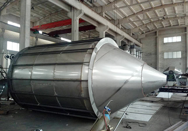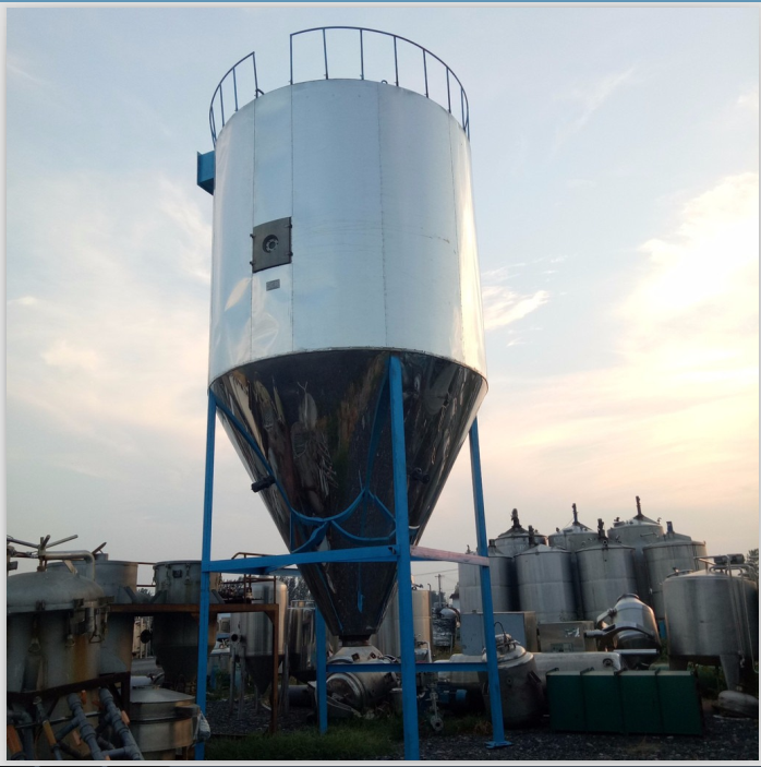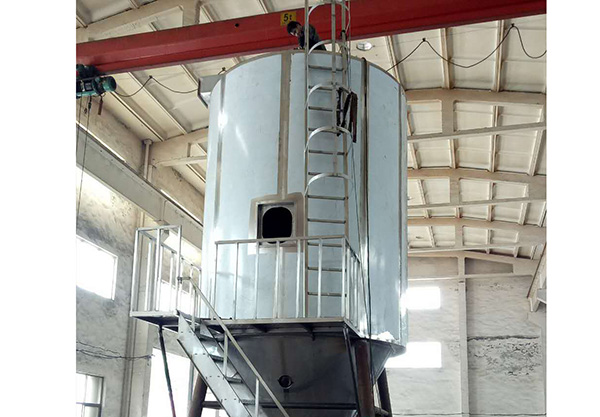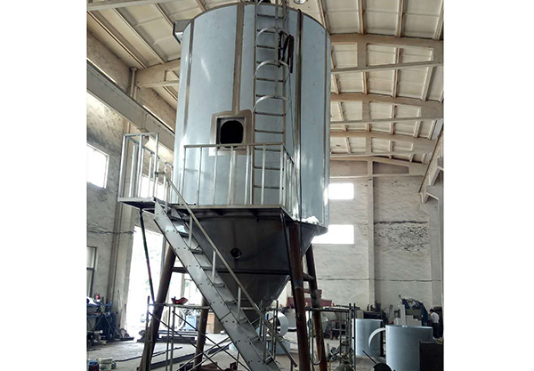 空氣通過過濾器和加熱器,進(jìn)入干燥器頂部的空氣分配器,熱空氣呈螺旋狀均勻進(jìn)入干燥器。料液由料液槽經(jīng)過濾器由泵送至干燥器的離心霧化器,使料液噴成極小的霧狀液滴,料液和空氣并流接觸,水份迅速蒸發(fā),在極短的時間內(nèi)干燥為成品,成品由干燥塔底部和旋風(fēng)分離器排出,廢氣由風(fēng)機(jī)排出。